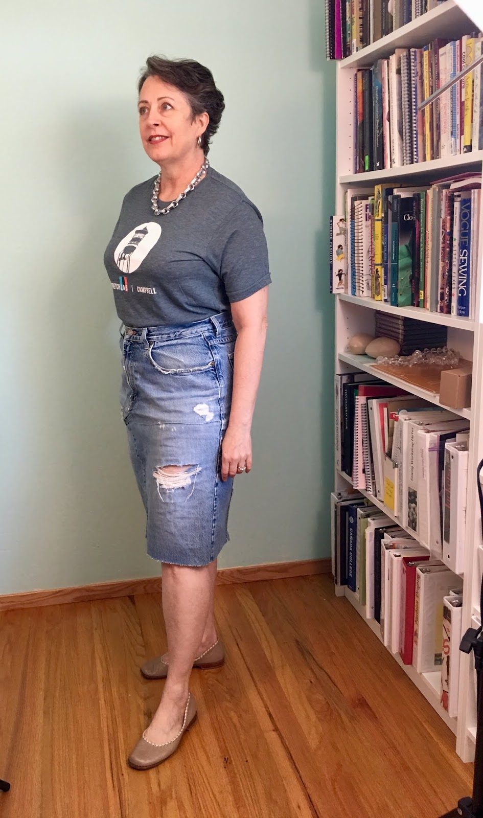 The rest was all overlaying, pinning, trying on, re-overlay, re-pin, try on, and repeat literally 15+ times. I was able to conform the skirt to my figure using this method. I left the hem raw, being very careful not to cut it too short. It took 5 tries cutting off a bit at a time to get the length I wanted. To determine where to cut, I marked in while I had it on so I liked where it fell. After seeing these photos I think I can go a bit shorter in the back.