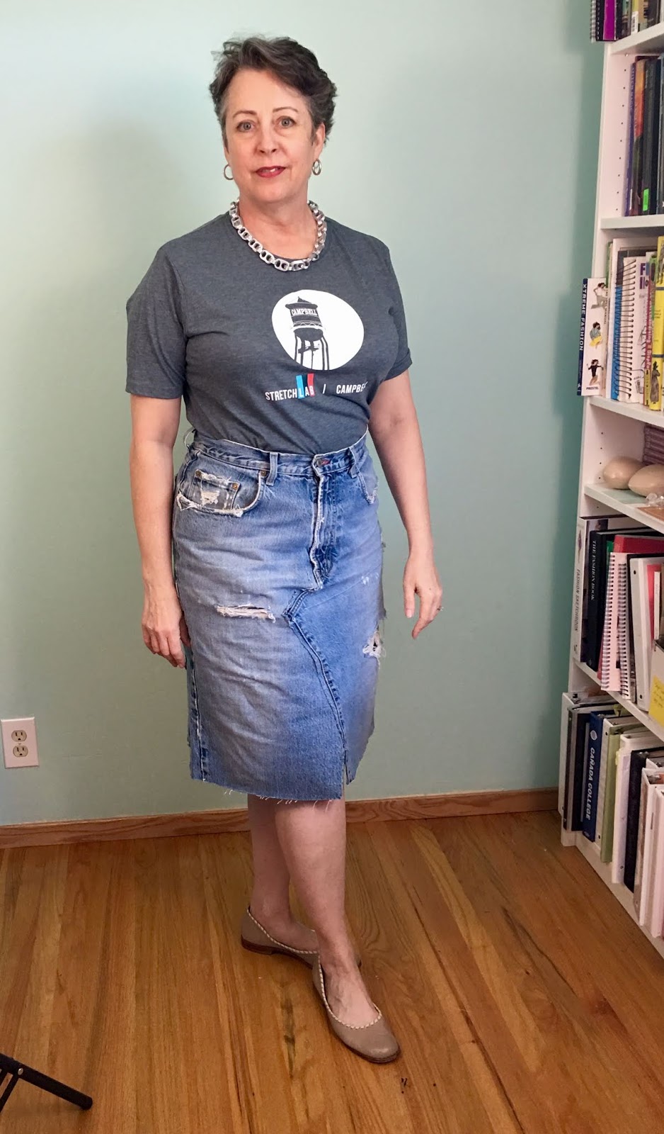 Starting with a pair of jeans purchased from a customer, I set about making a 60's/70's style hippie skirt only at knee length. The jeans arrived with wear and holes that were come by honestly by her husband working in the pants (l like that!).