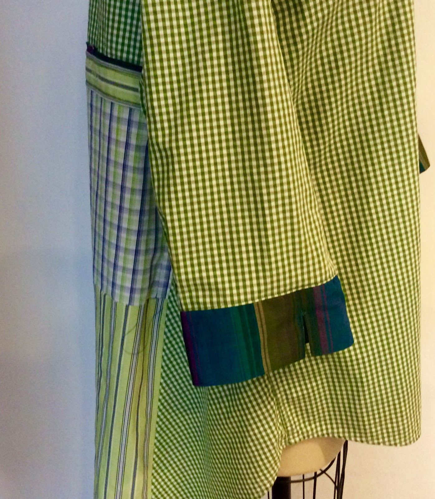 Building a Patti starts with selecting three dress shirts, one of which fits you well in the chest, arms and shoulders. The other two shirts will be cut up (deconstructed) and portions will be added back onto the shirt that fits just right, creating an entirely new silhouette. Alternatively, the back panel can be made with other garments, such as skirts, or with flat fold cloth.